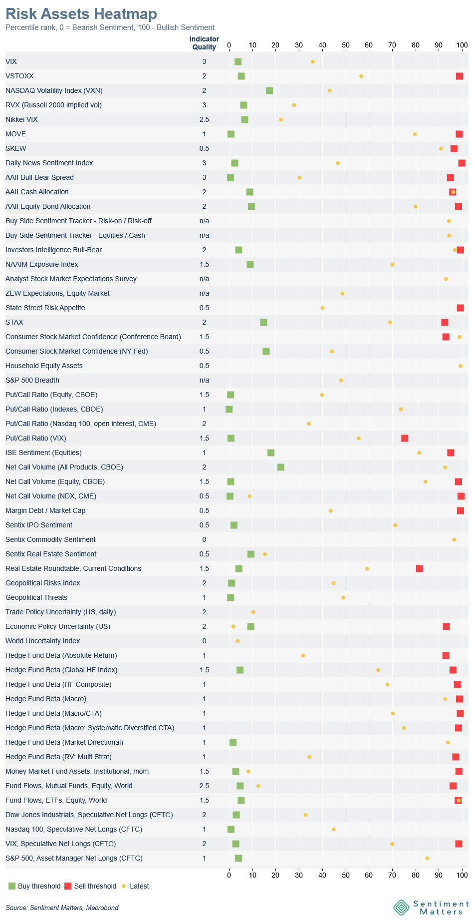 An evidence-based approach to sentiment analysis starts with a framework that considers the breadth and reliability of multiple indicators rather than relying on a few that confirm your bias. At Sentiment Matters, we use and back-test more than 500 sentiment indicators across asset classes to provide a more balanced, data-driven view of where investor sentiment truly stands.