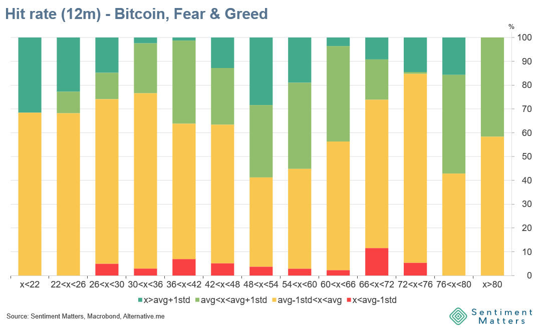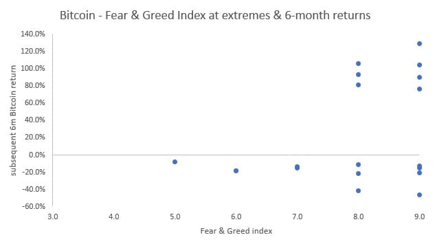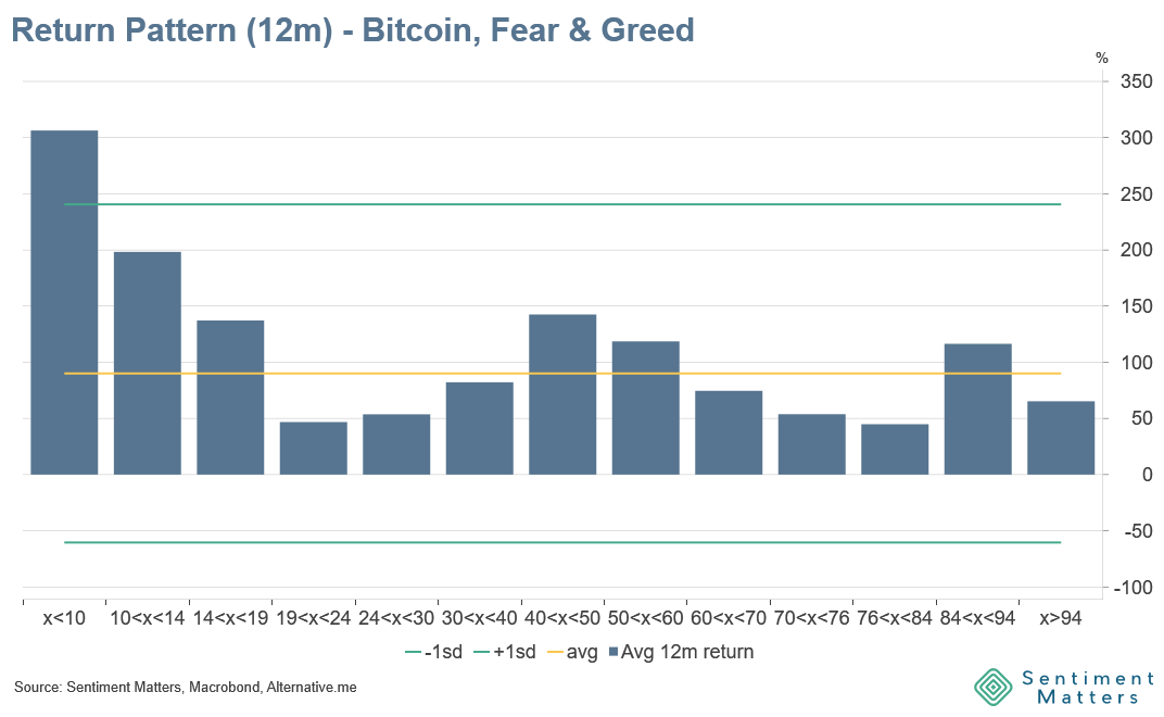 - When the index has been below 10, Bitcoin’s average 12-month return has been very strong (around +306% in the sample).
