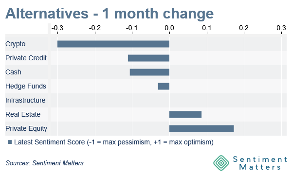- Private assets: rotation within privates — Private Credit down, Private Equity up