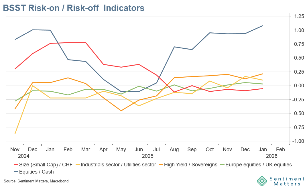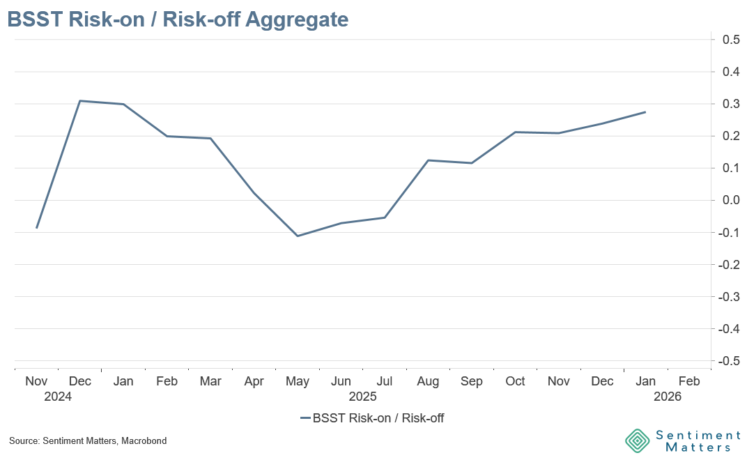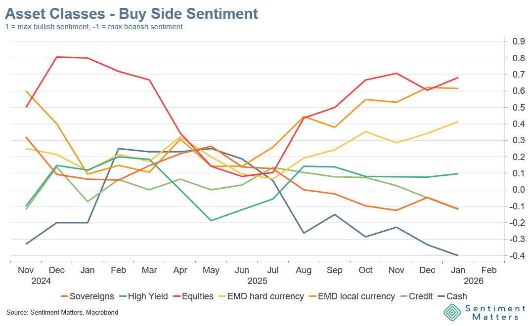 - Japan: the “Takaichi bounce” has faded. Downgraded this month; now +31% net bullish. Still room for upside if reform/fiscal optimism gets validated by data.