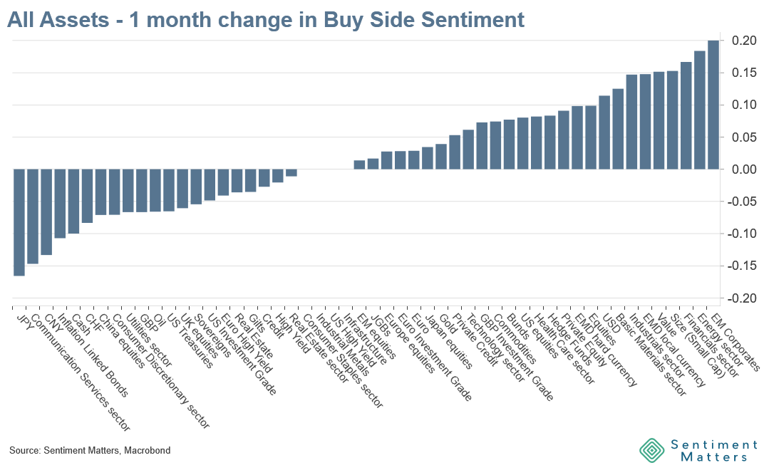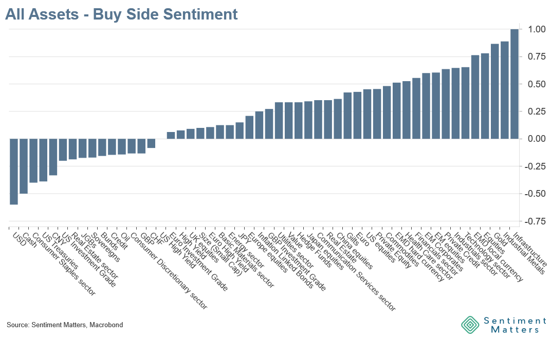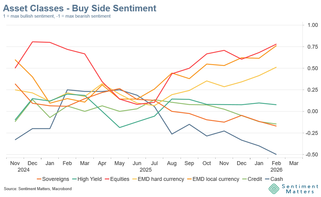 - Emerging Markets: divergence is widening — EM equities & EM debt loved, while China equities downgraded for a 4th straight month