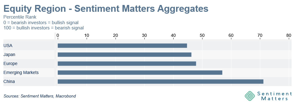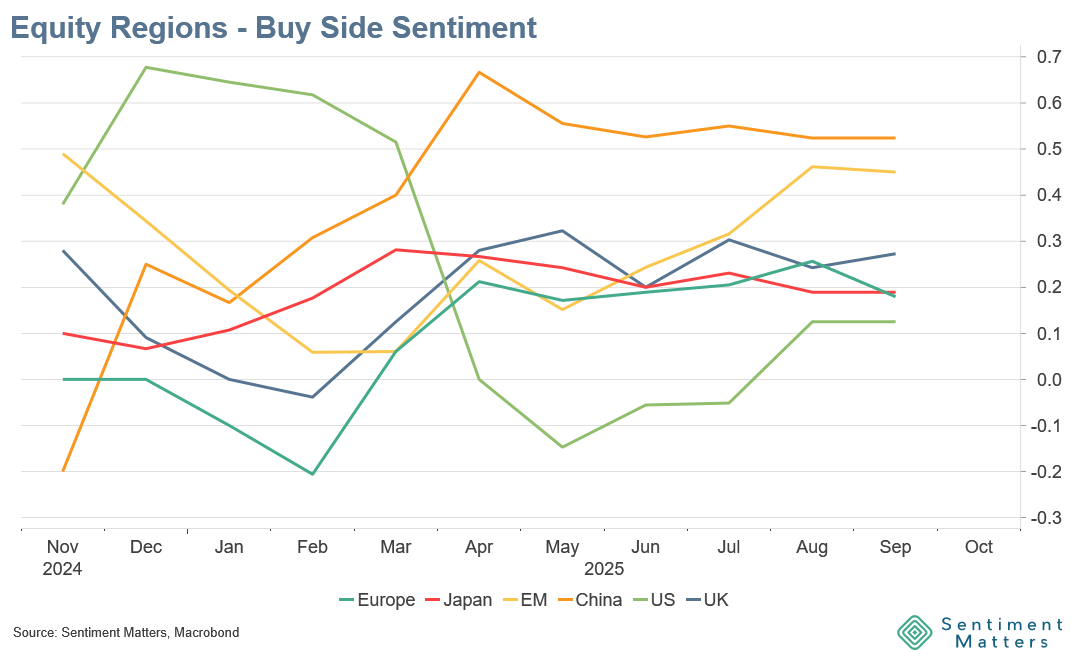 By comparison, sentiment towards developed markets is neutral at best. The US has been drifting steadily lower all year, Europe has lost the optimism that carried it through spring and now sits below neutral, while Japan is also middling but with a more positive trajectory.