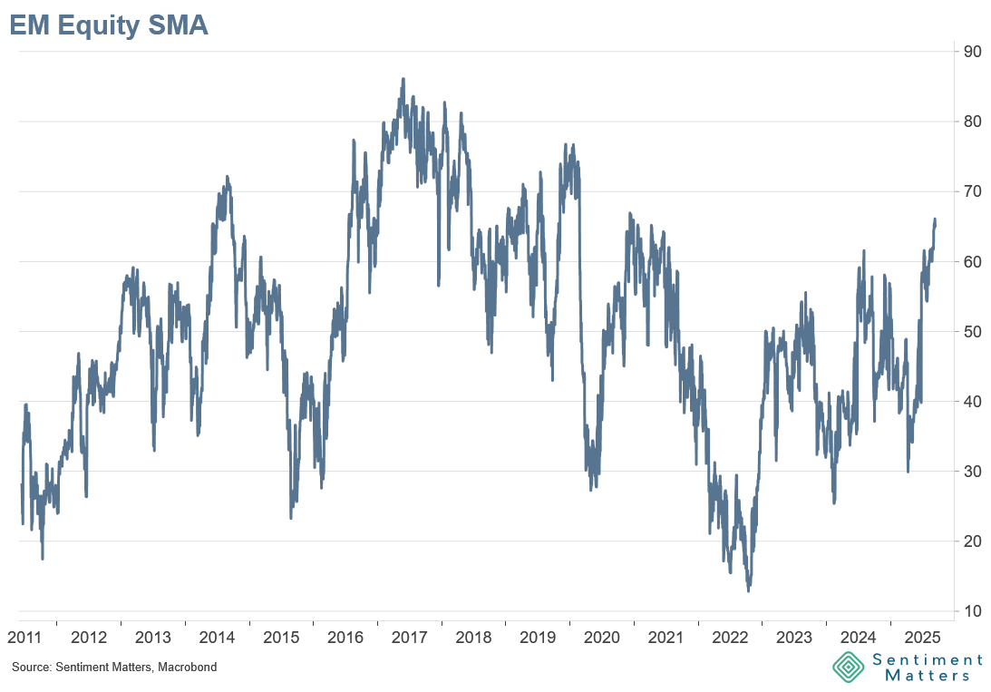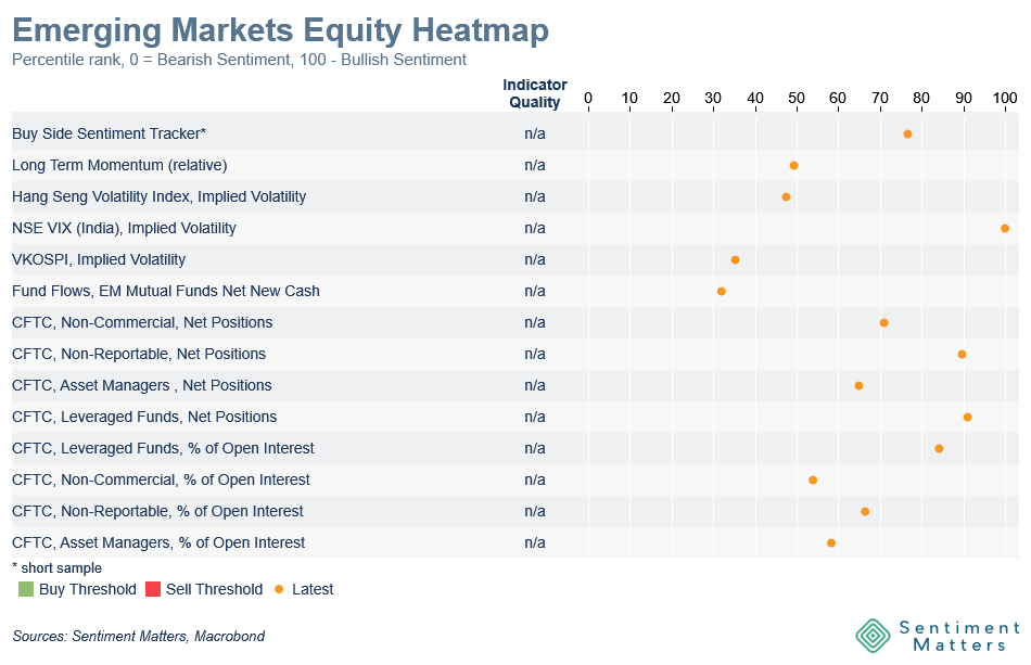 Our Sentiment Matters Aggregate for EM equities now sits at the 65th percentile. The heatmap shows strength across most of the indicators we track, a broad-based recovery.
