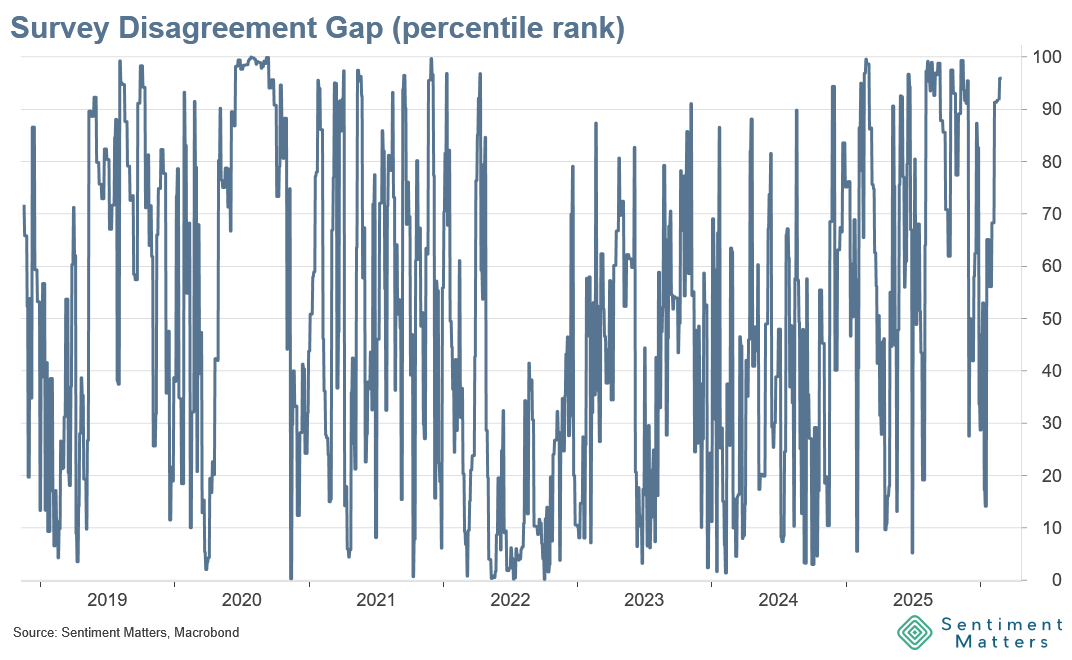 Last week I wrote about the mixed messages coming from three popular investor surveys. The latest prints have pushed the headline disagreement even further: the gap between AAII Bull–Bear, Investors Intelligence Bull–Bear, and NAAIM Exposure has only been larger 4% of the time.