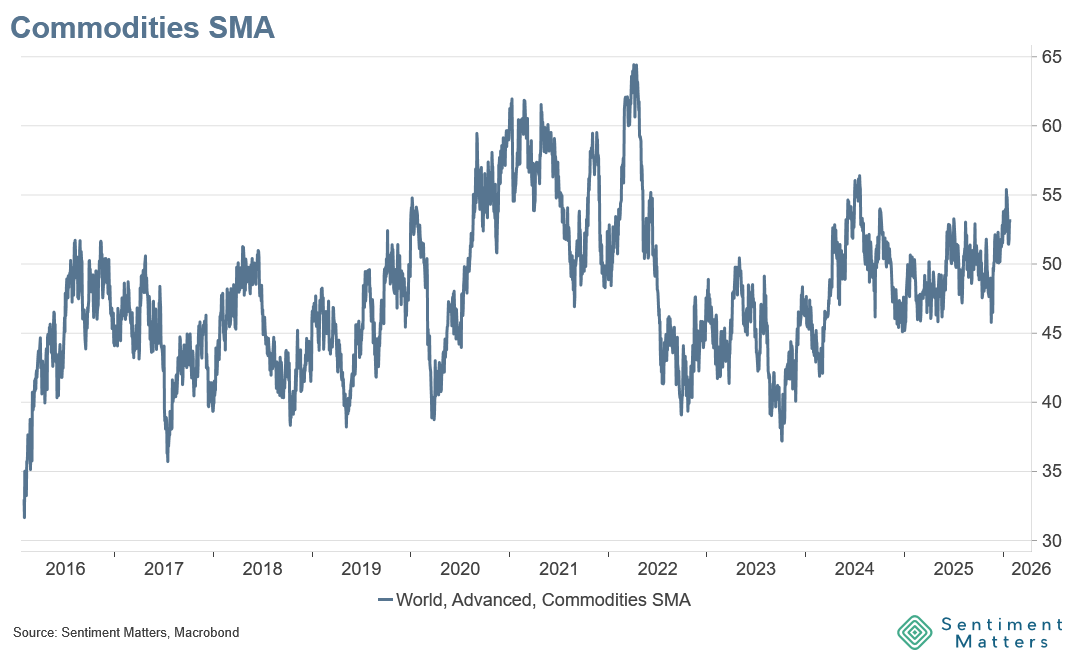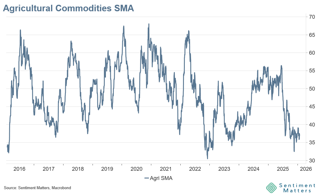 - Importantly, it’s not just low — it’s been falling. Soft commodity sentiment has slid from the 57th percentile in mid-2025 down toward ~30th percentile, taking sentiment close to 15-year lows.