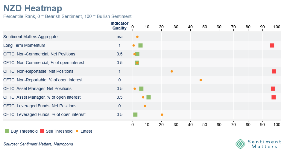 Since the June 2025 peak, our Sentiment Matters Aggregate for the Kiwi has fallen alongside the exchange rate. The average indicator we track was at the 55th percentile at the start of July, and fell as low as the 12th percentile in December.