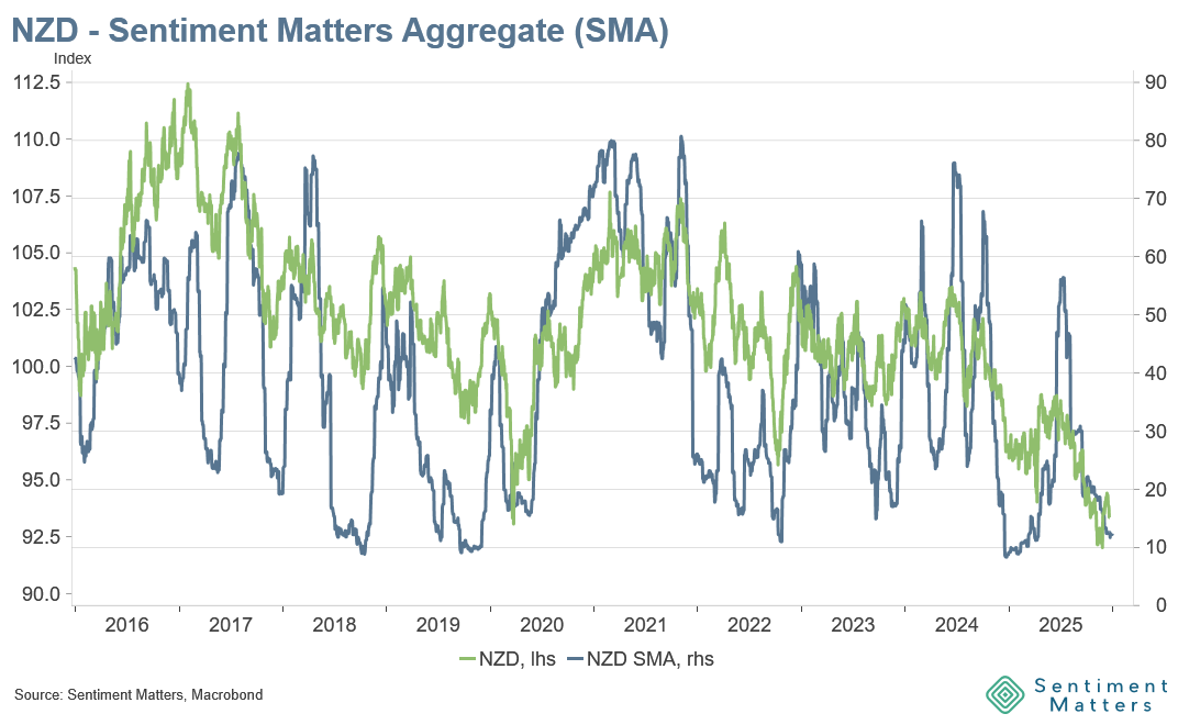 The goal of this note isn’t to call the exact bottom in Kiwi/USD (we may already have seen it). It’s to do what sentiment analysis is good at: