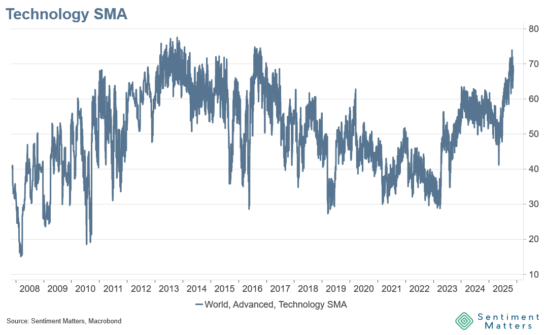 Our Sentiment Matters Aggregate for Technology has risen sharply since its post–Liberation Day lows. In April, the average indicator in our heatmap sat at the 48th percentile — essentially neutral. By late 2025 it had climbed to roughly the 75th percentile, the highest level in around 15 years.