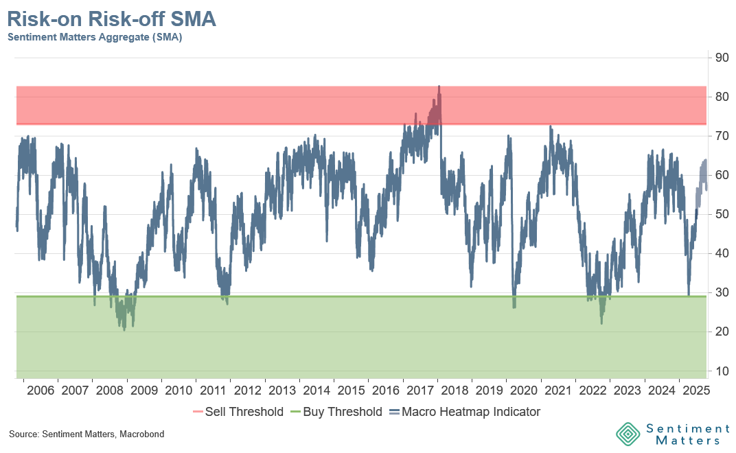 The chart below shows our Risk-on Risk-off Sentiment Matters Aggregate (SMA) across dozens of quality indicators, which currently sits at the 58th percentile. That is higher than most of the summer and below the 2024 high of 66. This zone typically corresponds to below-average 12-month equity returns.