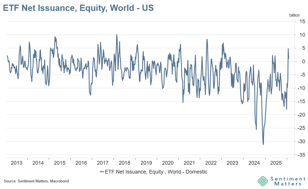 - World equity ETF issuance has been trending higher through 2025, and last week’s spike takes it to a new extreme.